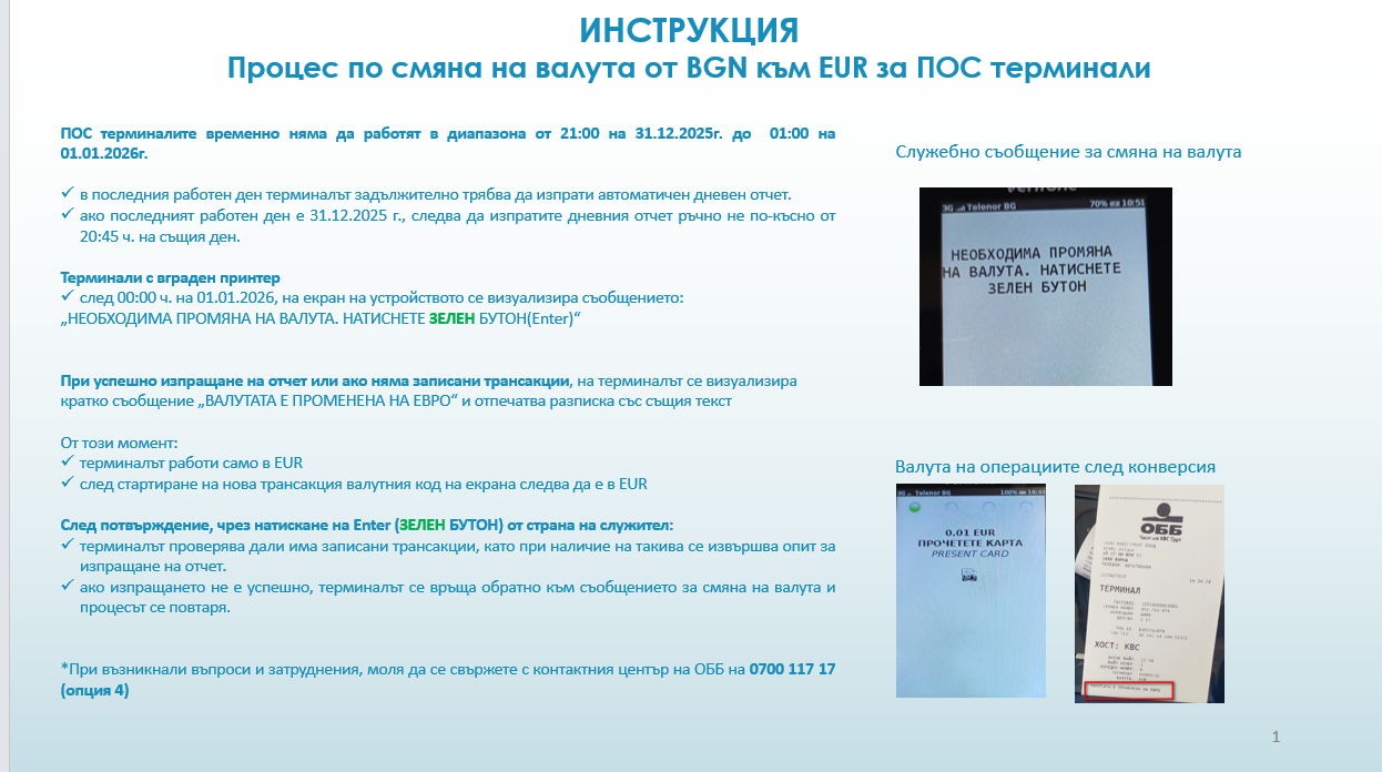 1. ПОС терминалите временно няма да работят в диапазона от 21:00 на 31.12.2025г. до 01:00 на 01.01.2026г.