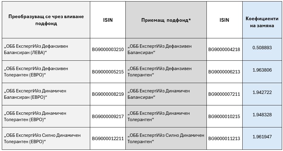 *Считано от ефективната дата на преобразуване 30.01.2026г., Приемащите подфондове променят наименованието си, като за в бъдеще няма да включват референция към валутата, евро или лева, поради деноминацията само в евро.